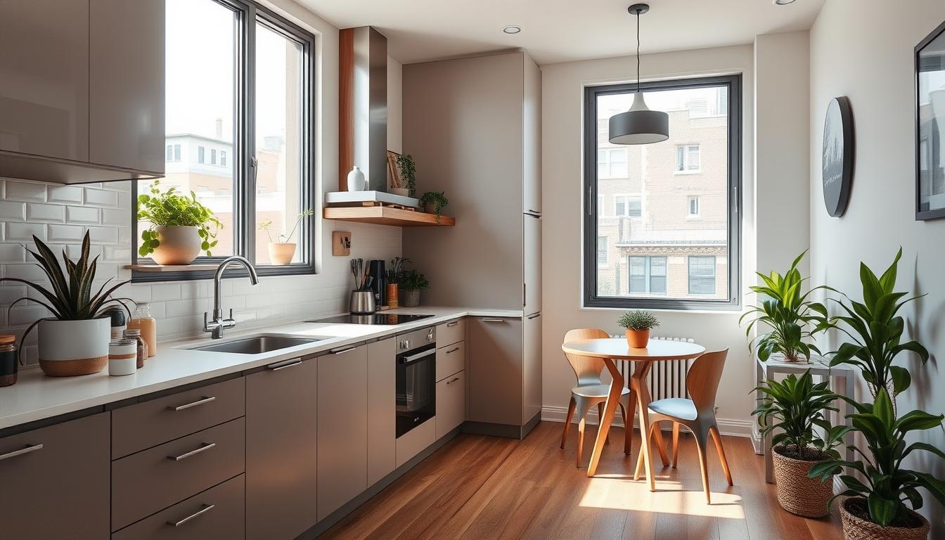 We use smart design solutions to make small kitchens more spacious. This includes vertical storage, multi-functional features, and choosing the right appliances. Our aim is to create a functional kitchen that looks great too.